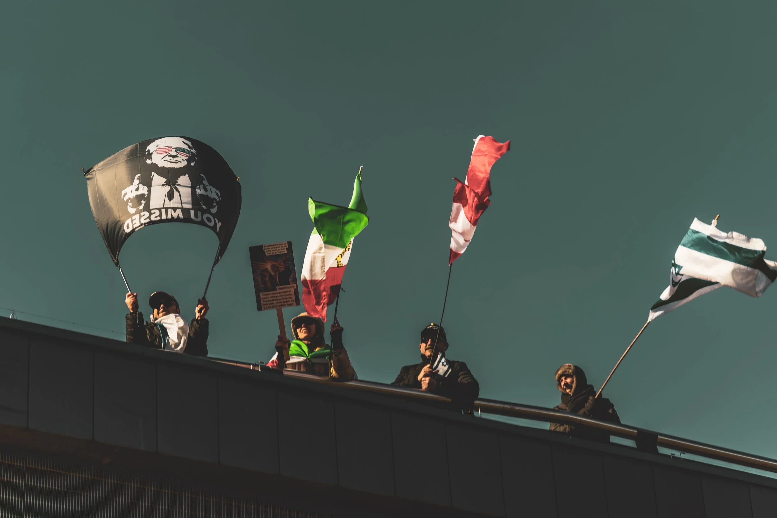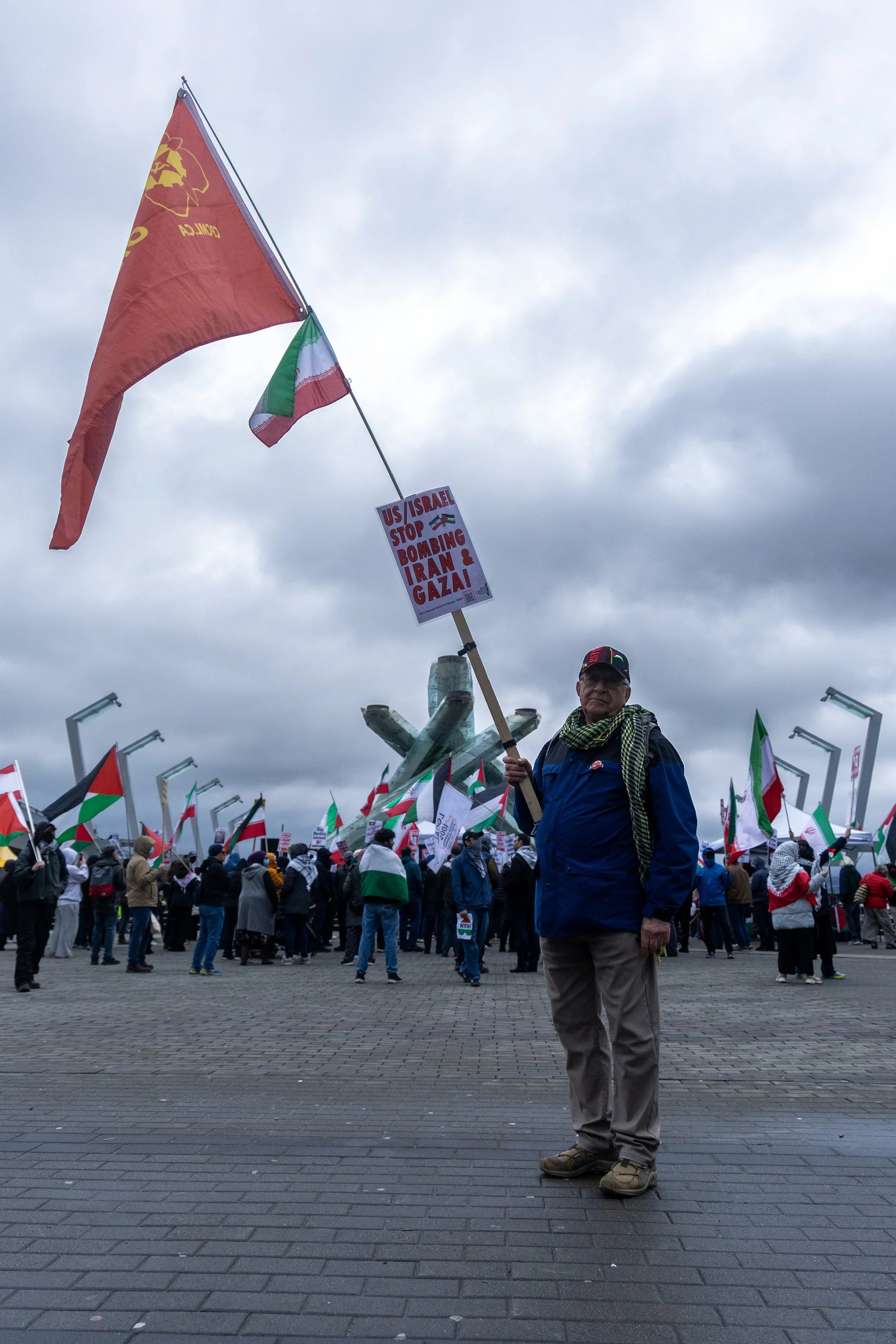 The woman holding the peace flag stood between the anti-war-on-Iran protesters and the pro-Israel, pro-Trump supporters. Rather than joining either side, she positioned herself directly in the middle, using the flag to promote peace between the two opposing groups.