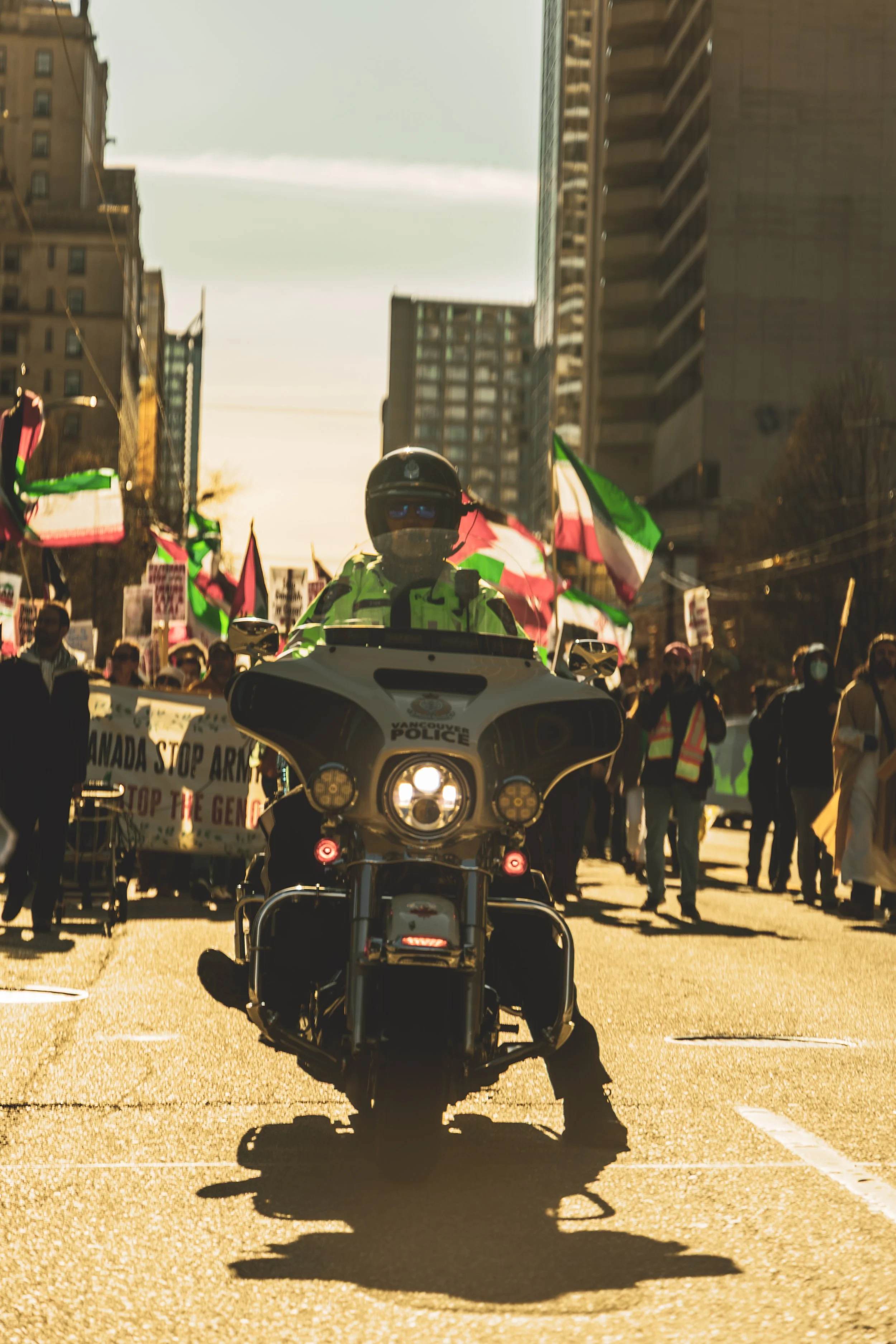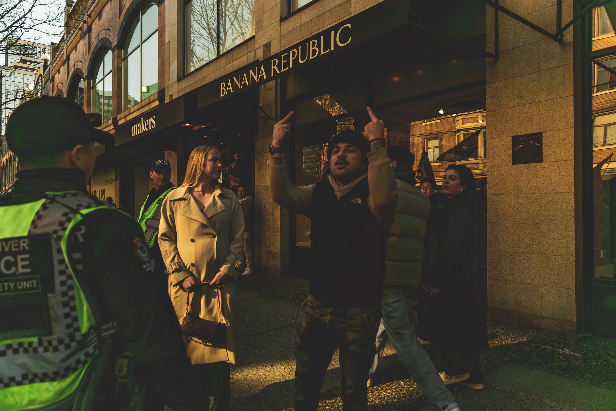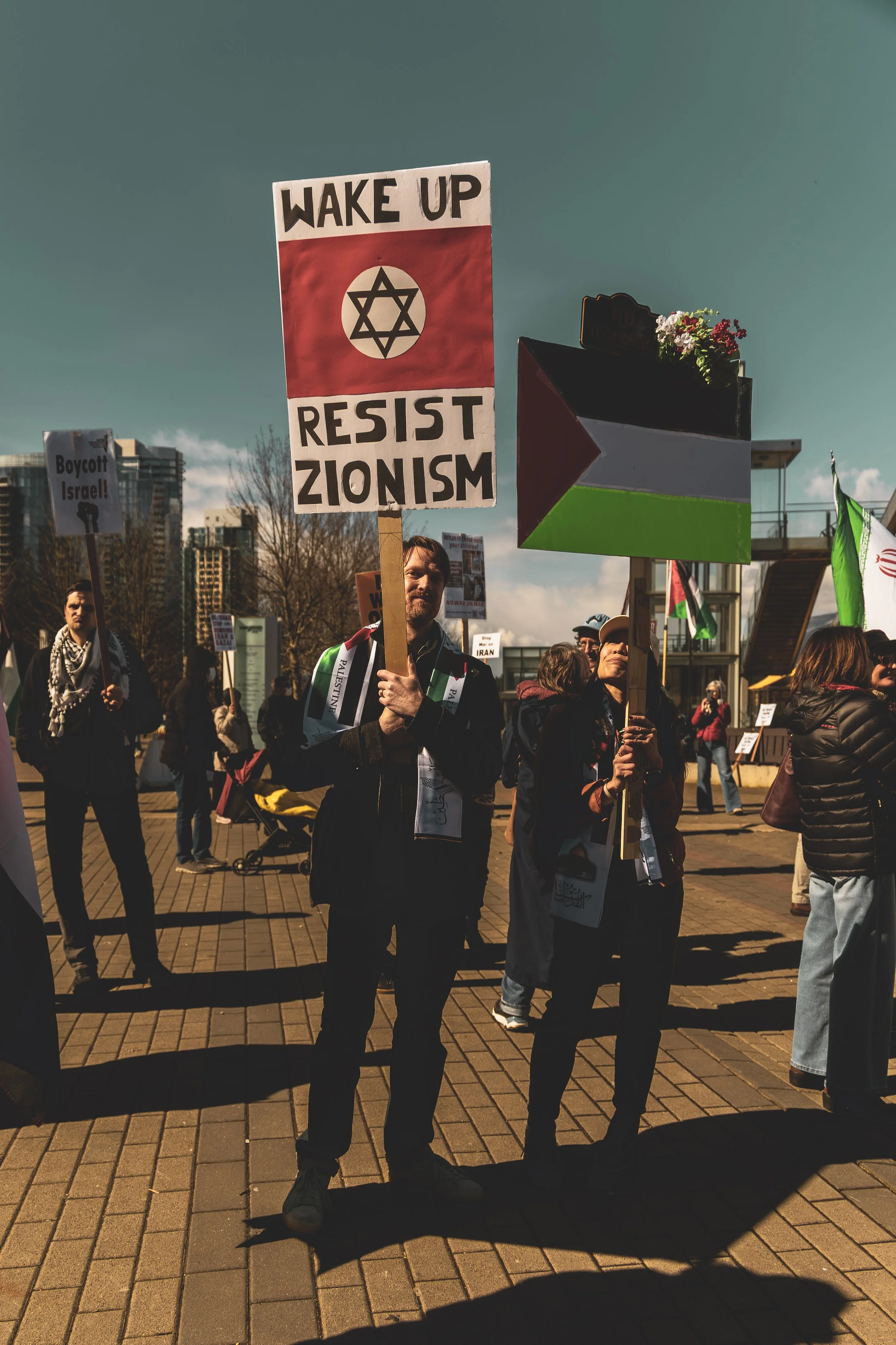 My takeaway from this event: While I was upstairs on top of the Cactus Club photographing the pro-Israel, pro-Trump protesters, a distinguished man by himself carrying a Palestinian flag walked through and past the crowd. He greeted them politely, saying, “Good day, gentlemen,” as he passed. In turn, they responded with courtesy, saying, “Good day. You’re holding the wrong flag, but that’s ok”, calmly acknowledging their differences in perspective.